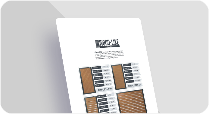 WOOD-LIKE SERIES About SKU - (Stock Keeping Unit) SKUs are unique identifying codes for each of the items we offer. We created our SKUs based on various characteristics of our products. We use them as a system to differentiate and categorize our products efficiently. You can request a specific model by referring to its SKU. Pedestrian WL100-1-1 Pedestrian G120-1-3 Double Swing WL100-2-1 Double Swing G120-2-3 Sliding WL100-S-1 Sliding G120-S-3 Overhead WL100-O-1 Overhead G120-O-3 Fence WL100-F-1 Fence F120-F-3 Panel P120-F-25 Panel P120-F-25 PROFILE 24 X 80 PROFILE 24 X 80 Pedestrian G120-1-4 Double Swing G120-2-4 Sliding G120-S-4 Overhead G120-O-4 Fence F120-F-4 Panel P120-F-25 PROFILE 24 X 80 Pedestrian G120-1-5 Sliding G120-S-5 Double Swing G120-2-5 Overhead G120-O-5 Panel P120-F-25 Fence F120-F-5 40