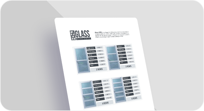 About SKU - (Stock Keeping Unit) SKUs are unique identifying codes for each of the items we offer. We created our SKUs based on various characteristics of our GLASS products. We use them as a system to differentiate and categorize our products WHITE SERIES efficiently. You can request a specific model by referring to its SKU. Single Swing G180B-1-3 Pedestrian G180-1-3 Double Swing G180B-2-3 Double Swing G180-2-3 Sliding G180B-S-3 Sliding G180-S-3 Overhead G180B-O-3 Overhead G180-O-3 Fence F180B-F-3 Fence F180-F-3 Panel P120-F-25 Panel P180-F-25 2 ROWS 3 ROWS Pedestrian G180-1-2 Pedestrian G180-1-5 Double Swing G180-2-2 Double Swing G180-2-5 Sliding G180-S-2 Sliding G180-S-5 Overhead G180-O-2 Overhead G180-O-5 Fence F180-F-2 Fence F180-F-5 Panel P180-F-25 Panel P180-F-25 4 ROWS 5 ROWS Pedestrian G180-1-2 Double Swing G180-2-2 Sliding G180-S-2 Overhead G180-O-2 Fence F180-F-2 Panel P180-F-25 6 ROWS 26
