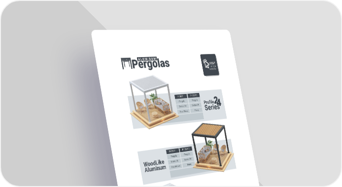 ALUMINUM Pergolas VISIT on the website P120-P-1 P120-P-2 Pergola Pergola Profile Series 24 Series 24 Post Mount Hang Series P120-P-1 P120-P-2 WoodLike Pergola Pergola Aluminum Series 24 Series 24 Post Mount Hang P135-P-1 P135-P-2 Pergola Pergola Hi-Tech Series 24 Series 24 Post Mount Hang Floating 58
